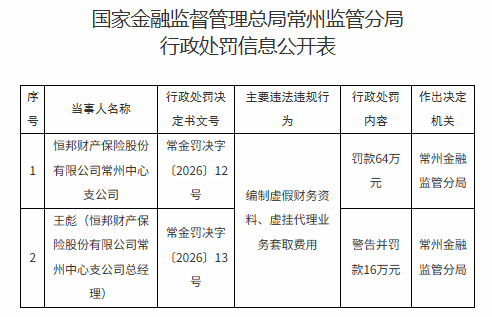 恒邦财产保险股份有限公司常州中心支公司总经理王彪受到警告并罚款16万元处罚。