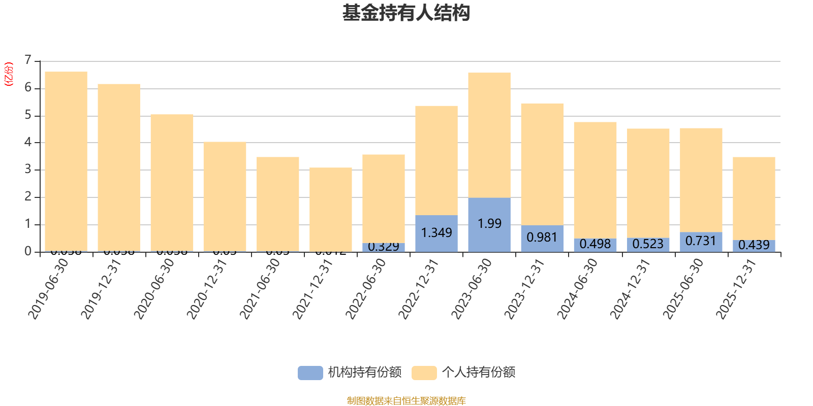 截至2025年12月31日,基金持有人共计2.67万户,合计持有3.48亿份。其中管理人员工持有77.7万份,占比0.22%,机构持有份额占比12.63%,个人投资者占比87.37%。