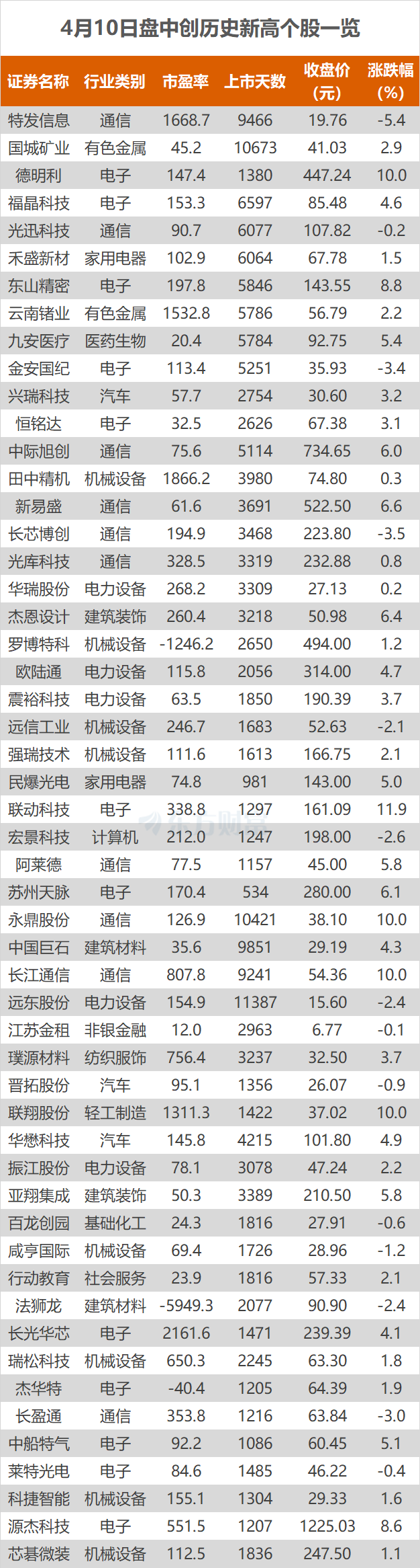 4月10日,A股三大指数今日集体上涨,沪指盘中一度重上4000点大关,创业板指创2021年12月以来的阶段新高。截止收盘,沪指涨0.51%,收报3986.22点;深证成指涨2.24%,收报14309.47点;创业板指涨3.78%,收报3448.79点。东方财富Choice数据显示,今日有53只个股盘中股价创历史新高,分别为永鼎股份、东山精密等。
