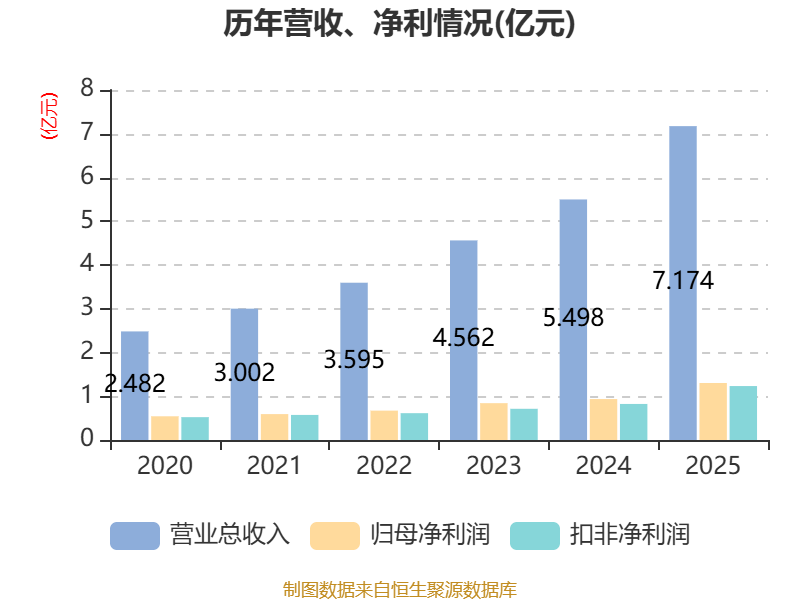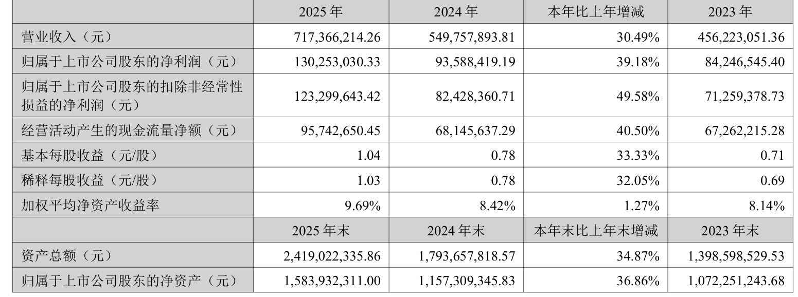中证智能财讯国能日新(301162)4月11日披露2025年年度报告。2025年,公司实现营业总收入7.17亿元,同比增长30.49%;归母净利润1.3亿元,同比增长39.18%;扣非净利润1.23亿元,同比增长49.58%;经营活动产生的现金流量净额为9574.27万元,同比增长40.50%;报告期内,国能日新基本每股收益为1.04元,加权平均净资产收益率为9.69%。公司2025年度分配预案为:拟向全体股东每10股转4股,派现4.5元(含税)。