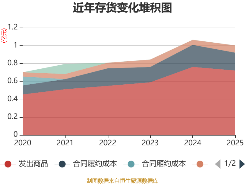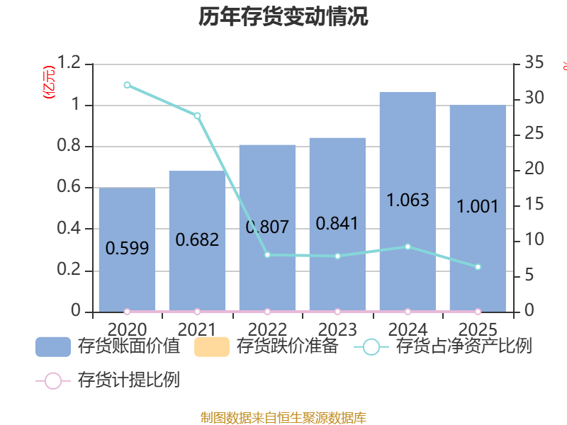 从存货变动来看,截至2025年末,公司存货账面价值为1亿元,占净资产的6.32%,较上年末减少620.39万元。公司本期没有计提存货跌价准备。