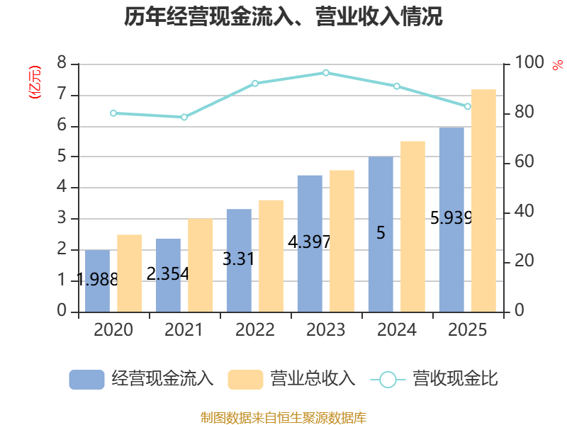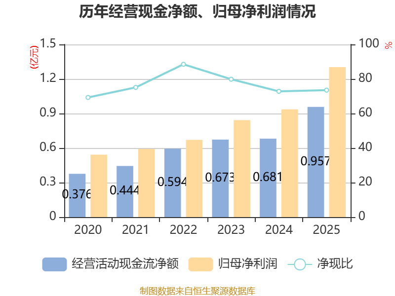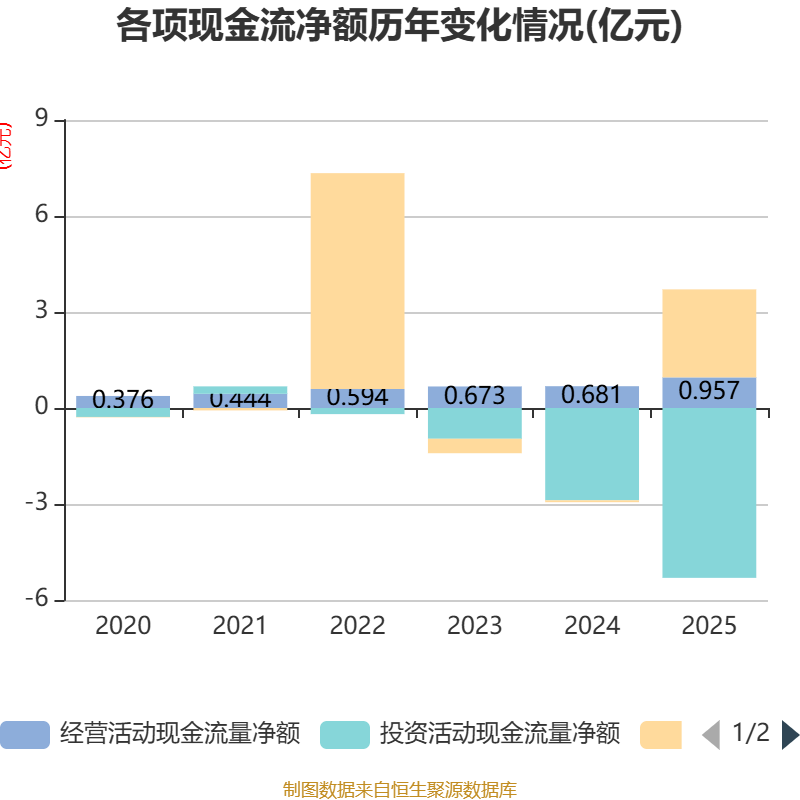 截至2025年,公司经营活动现金流净额为9574.27万元,同比增长40.5%;筹资活动现金流净额2.75亿元,同比增加2.81亿元;投资活动现金流净额-5.31亿元,上年同期为-2.89亿元。