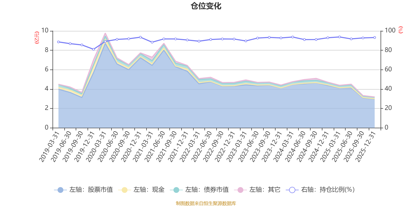 据定期报告数据统计,近三年平均股票仓位为92.38%,同类平均为72.57%。2025年一季度末基金达到93.77%的最高仓位,2019年末最低,为81.03%。