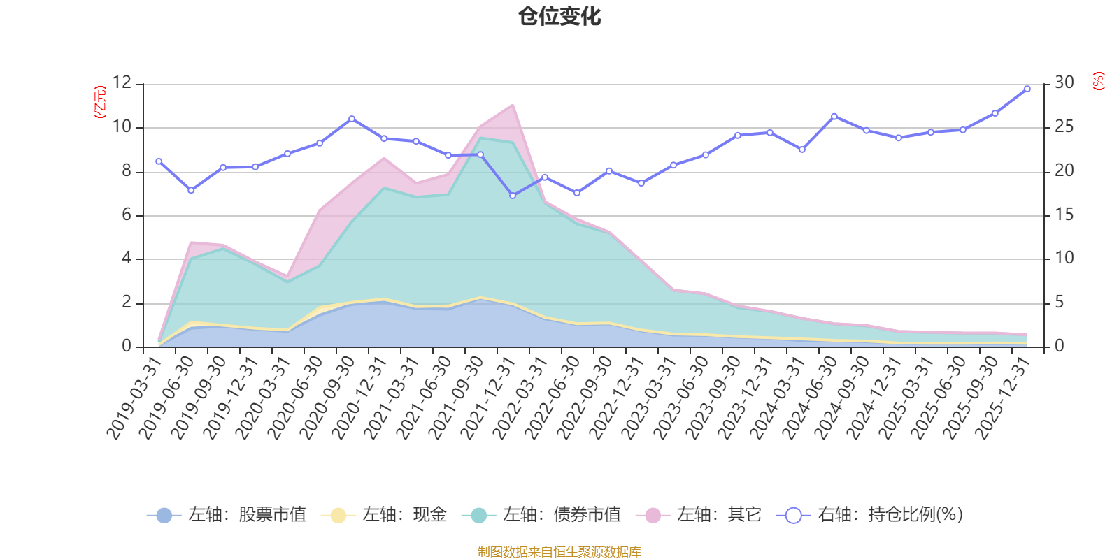 据定期报告数据统计,近三年平均股票仓位为24.49%,同类平均为72.57%。2025年末基金达到29.43%的最高仓位,2021年末最低,为17.26%。
