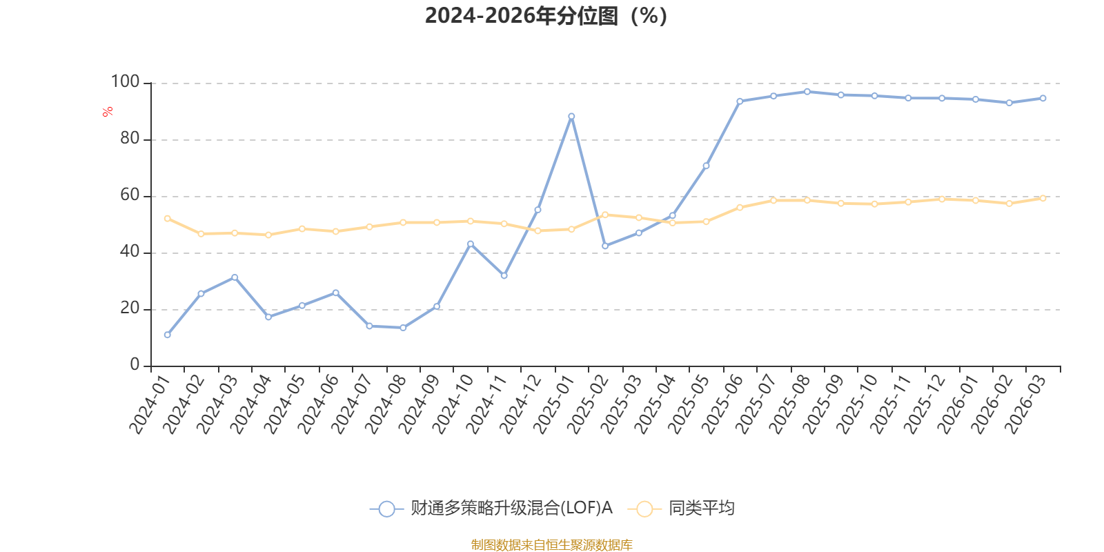 通过所选区间该基金净值增长率分位图,可以观察该基金与同类基金业绩比较情况。图为坐标原点到区间内某时点的净值增长率在同类基金中的分位数。