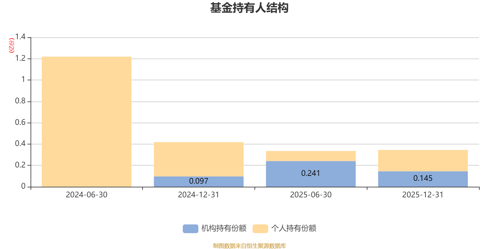 截至2025年12月31日,基金持有人共计396户,合计持有3451.76万份。其中管理人员工持有14.75万份,占比0.43%,机构持有份额占比41.93%,个人投资者占比58.07%。
