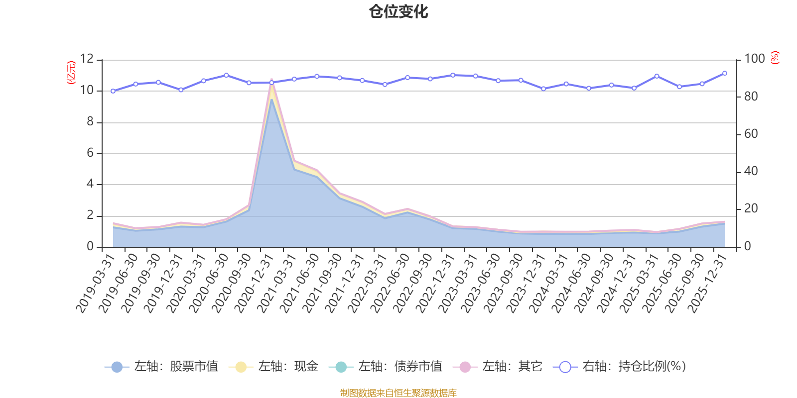 据定期报告数据统计,近三年平均股票仓位为87.79%,同类平均为85.83%。2025年末基金达到92.77%的最高仓位,2019年一季度末最低,为83.24%。