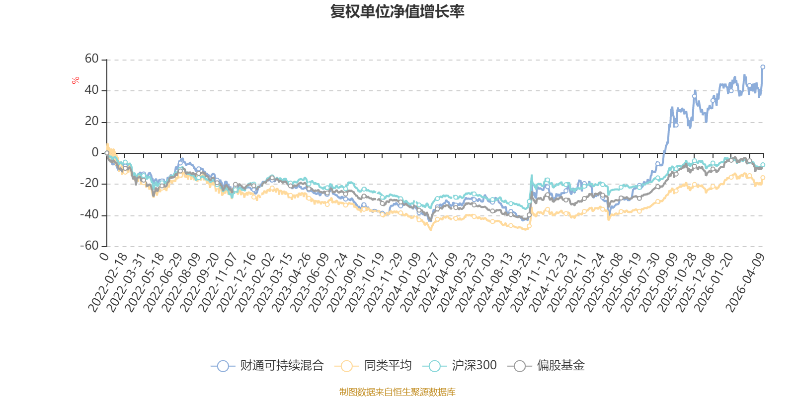 截至4月9日,财通可持续混合近三个月复权单位净值增长率为8.89%,位于同类可比基金48/621;近半年复权单位净值增长率为22.34%,位于同类可比基金17/621;近一年复权单位净值增长率为154.19%,位于同类可比基金8/618;近三年复权单位净值增长率为97.73%,位于同类可比基金13/559。
