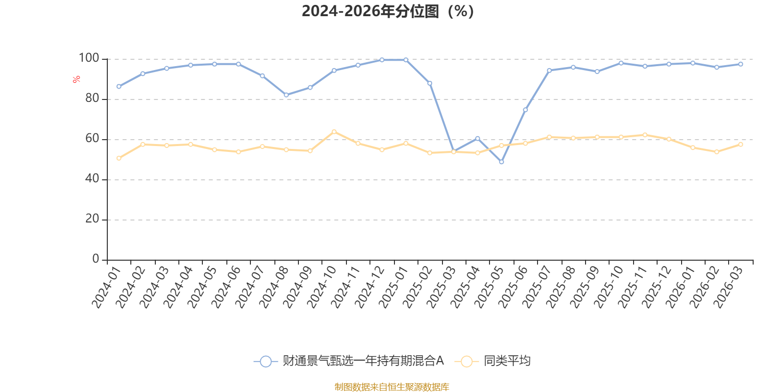 通过所选区间该基金净值增长率分位图,可以观察该基金与同类基金业绩比较情况。图为坐标原点到区间内某时点的净值增长率在同类基金中的分位数。