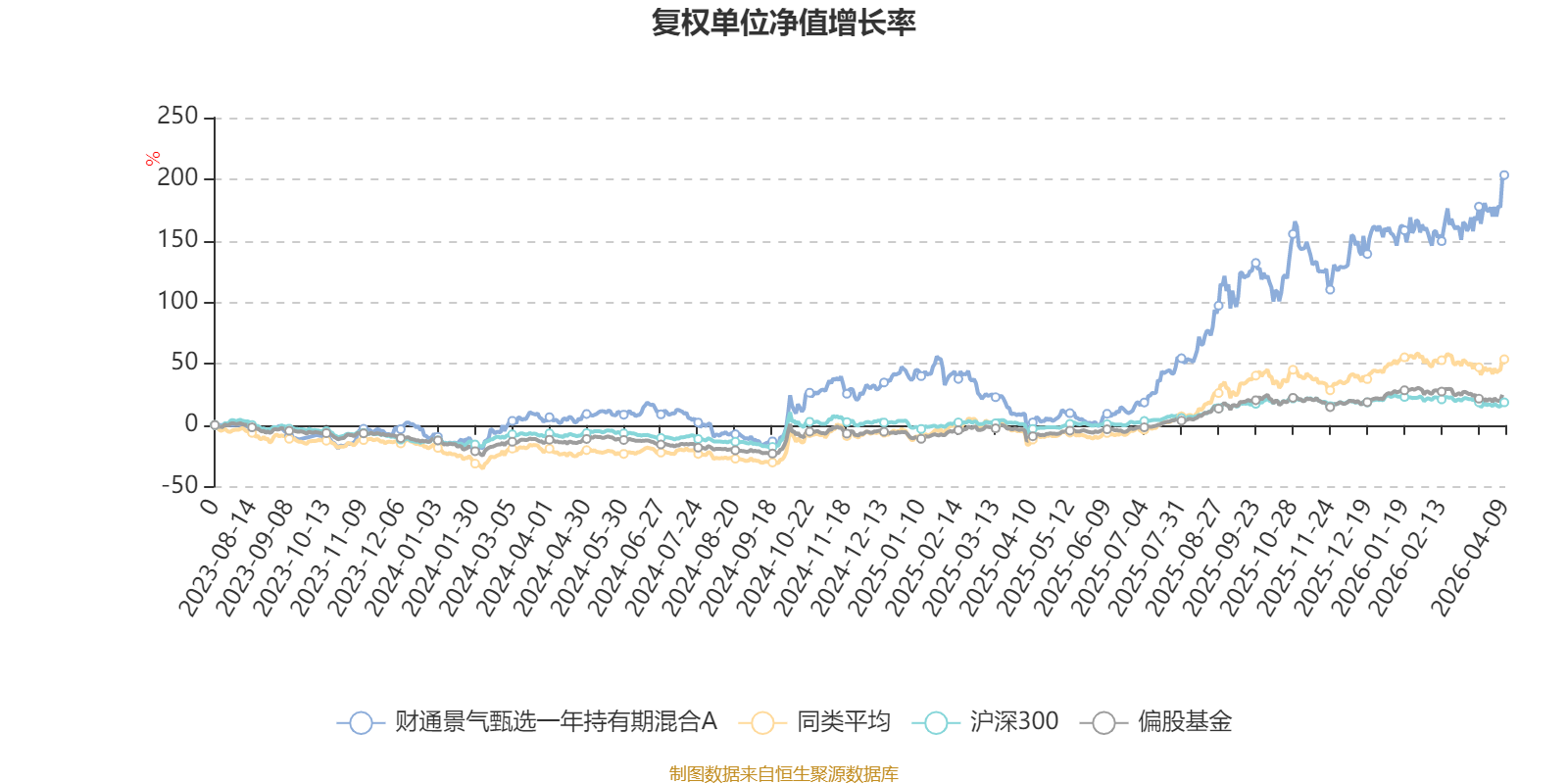 截至4月9日,财通景气甄选一年持有期混合A近三个月复权单位净值增长率为18.94%,位于同类可比基金9/229;近半年复权单位净值增长率为37.01%,位于同类可比基金6/229;近一年复权单位净值增长率为204.44%,位于同类可比基金4/229。