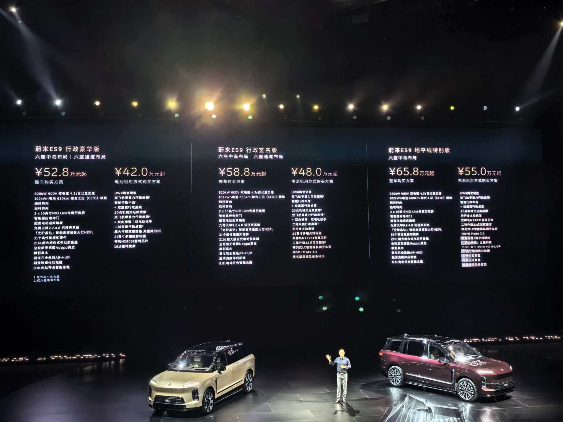 当晚,蔚来ES9正式开启预售,共推出行政豪华版、行政签名版、地平线特别版三个版本车型,将于5月底正式上市交付。其中,ES9行政豪华版电池租用方式购买方案预售价42万元起,整车购买方案预售价52.8万元起;ES9行政签名版电池租用方式购买方案预售价48万元起,整车购买方案预售价58.8万元起;ES9地平线特别版电池租用方式购买方案预售价55万元起,整车购买方案预售价65.8万元起。