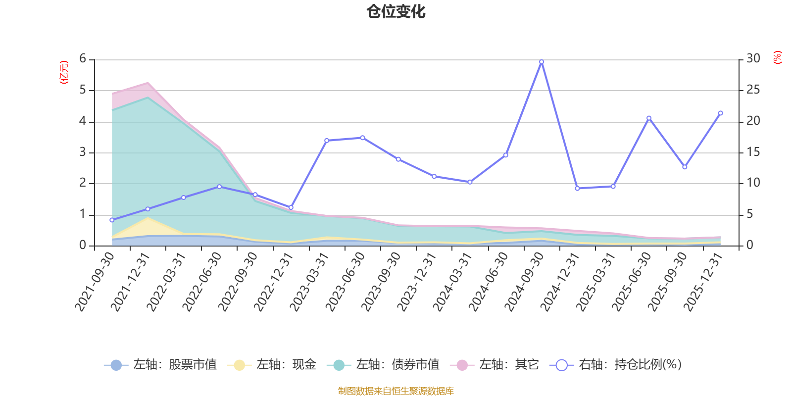 据定期报告数据统计,近三年平均股票仓位为15.61%,同类平均为19.2%。2024年三季度末基金达到29.62%的最高仓位,2021年三季度末最低,为4.15%。
