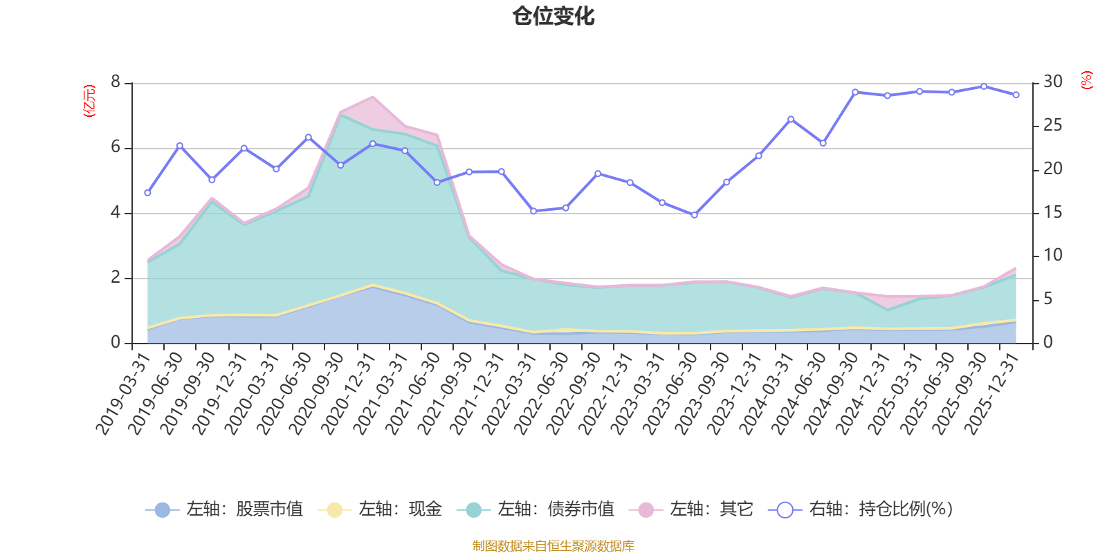 据定期报告数据统计,近三年平均股票仓位为24.48%,同类平均为19.2%。2025年三季度末基金达到29.61%的最高仓位,2023年上半年末最低,为14.78%。