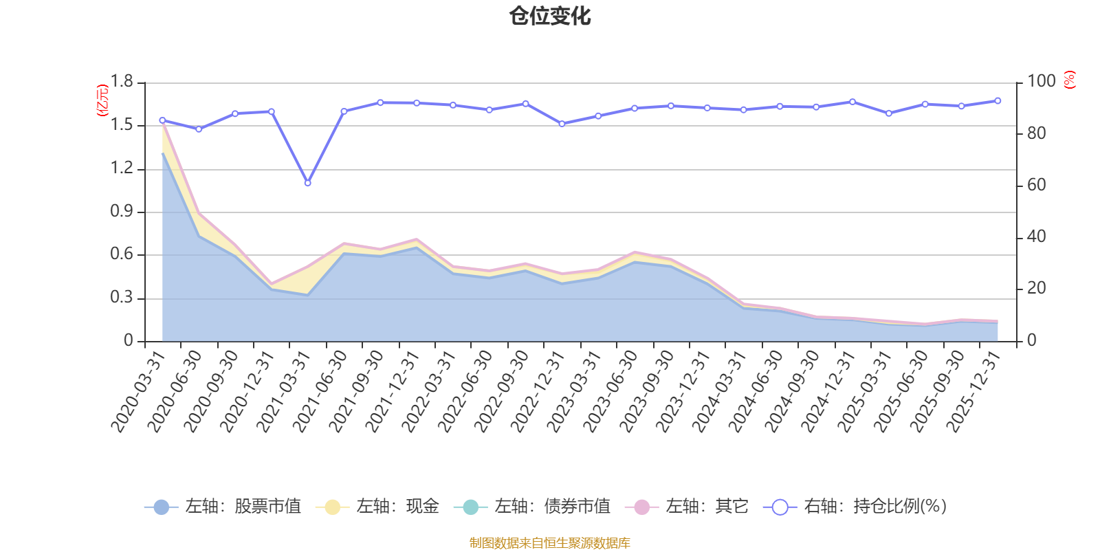 据定期报告数据统计,近三年平均股票仓位为90.43%,同类平均为84.04%。2025年末基金达到92.96%的最高仓位,2021年一季度末最低,为61.18%。