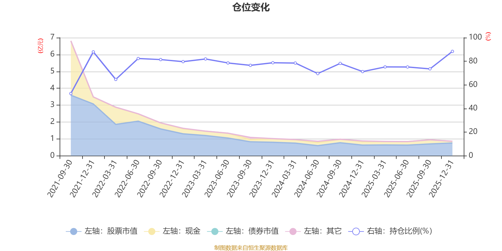 据定期报告数据统计,近三年平均股票仓位为77.15%,同类平均为84.04%。2025年末基金达到88.38%的最高仓位,2021年三季度末最低,为52.69%。