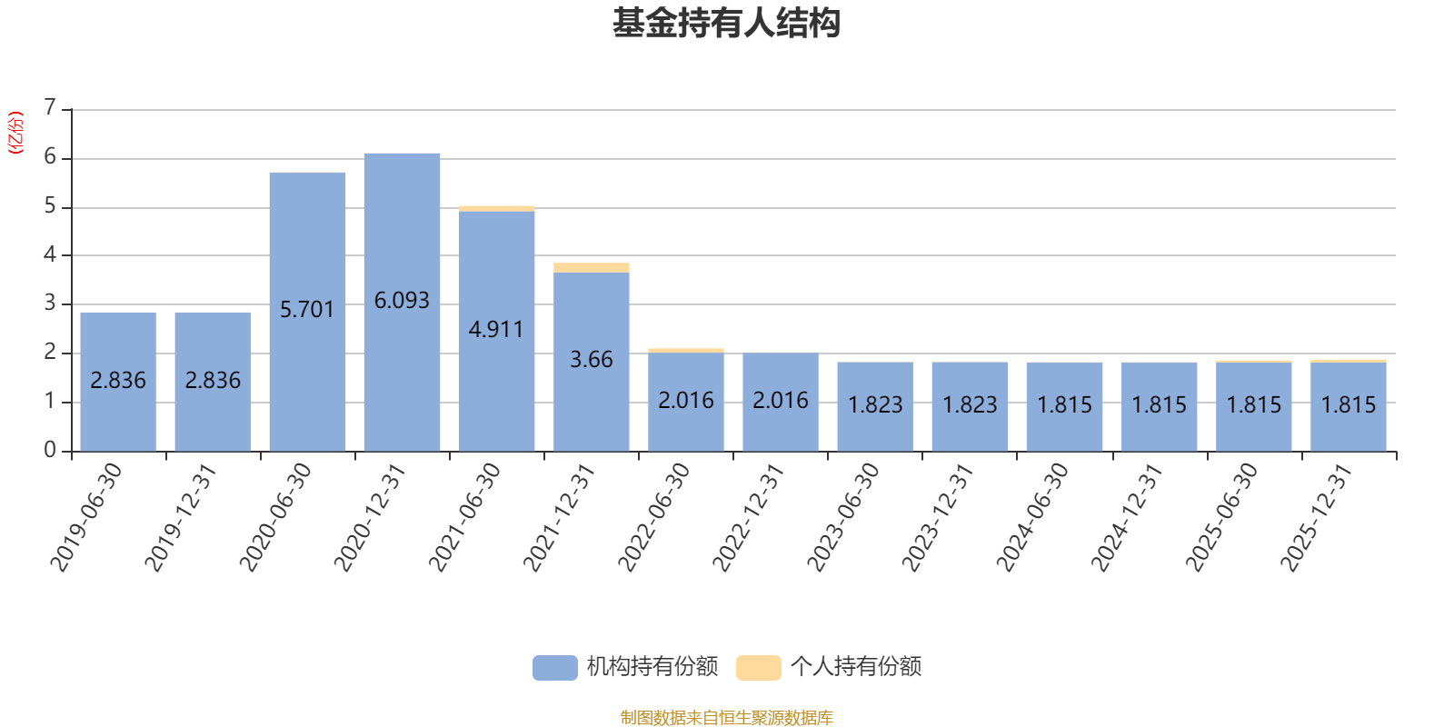 截至2025年12月31日,基金持有人共计394户,合计持有1.87亿份。其中管理人员工持有2.49万份,占比0.01%,机构持有份额占比97.09%,个人投资者占比2.91%。