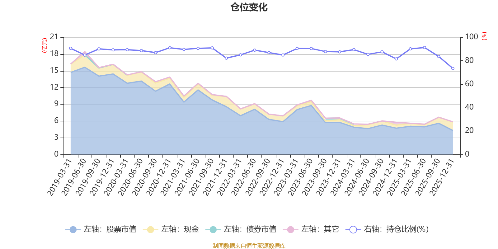 据定期报告数据统计,近三年平均股票仓位为86.62%,同类平均为72.57%。2025年上半年末基金达到91.33%的最高仓位,2025年末最低,为73.49%。