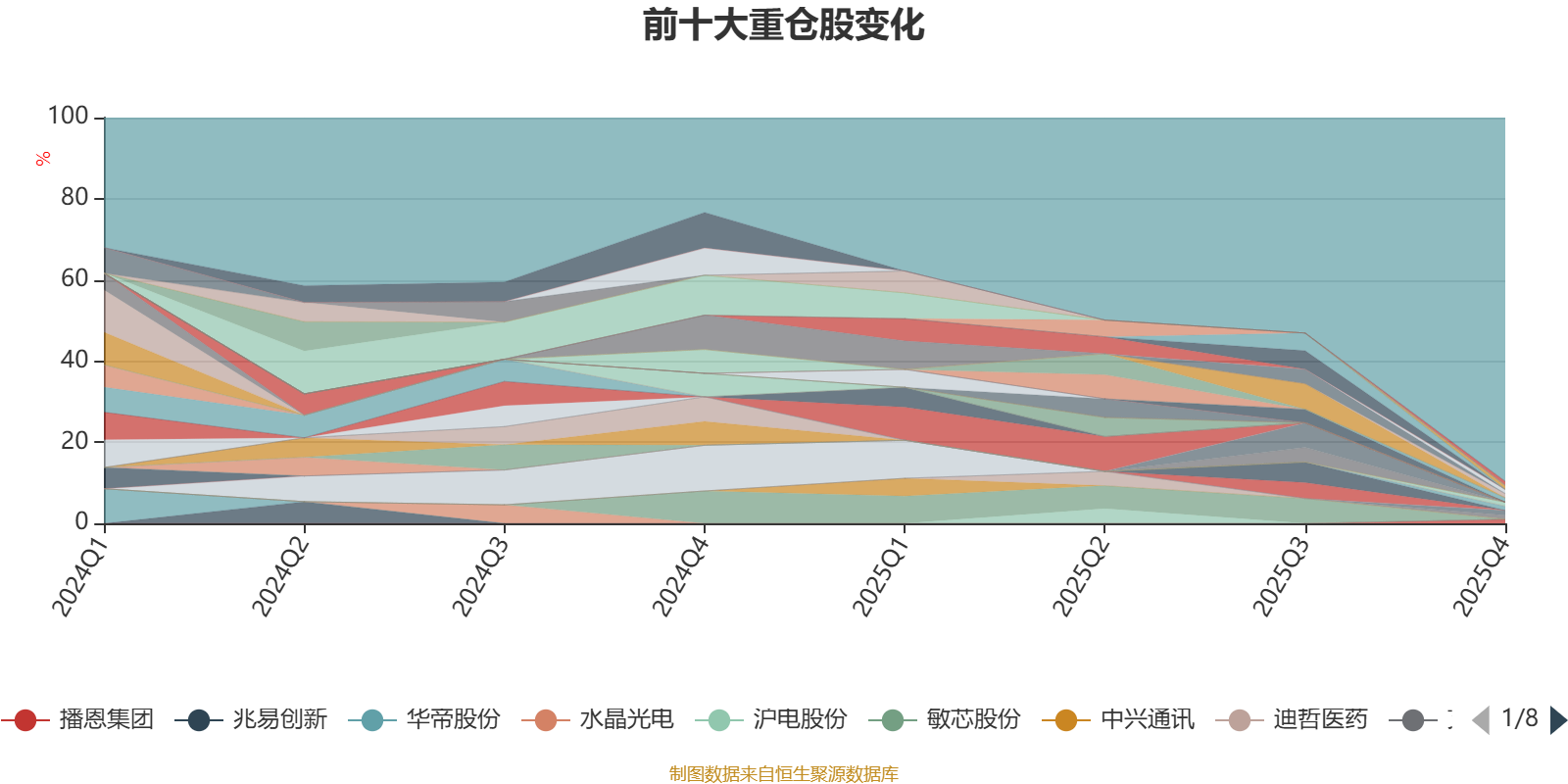 截至2025年末,基金十大重仓股分别是先锋电子、华信新材、歌力思、春雪食品、播恩集团、彩蝶实业、艾隆科技、威唐工业、海程邦达、近岸蛋白。