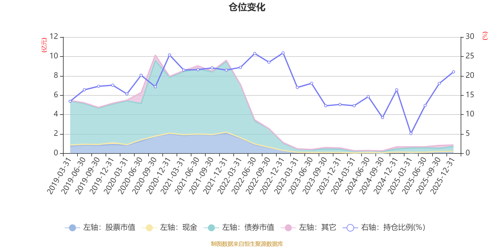 据定期报告数据统计,近三年平均股票仓位为14.07%,同类平均为19.2%。2022年末基金达到25.9%的最高仓位,2025年一季度末最低,为5.1%。