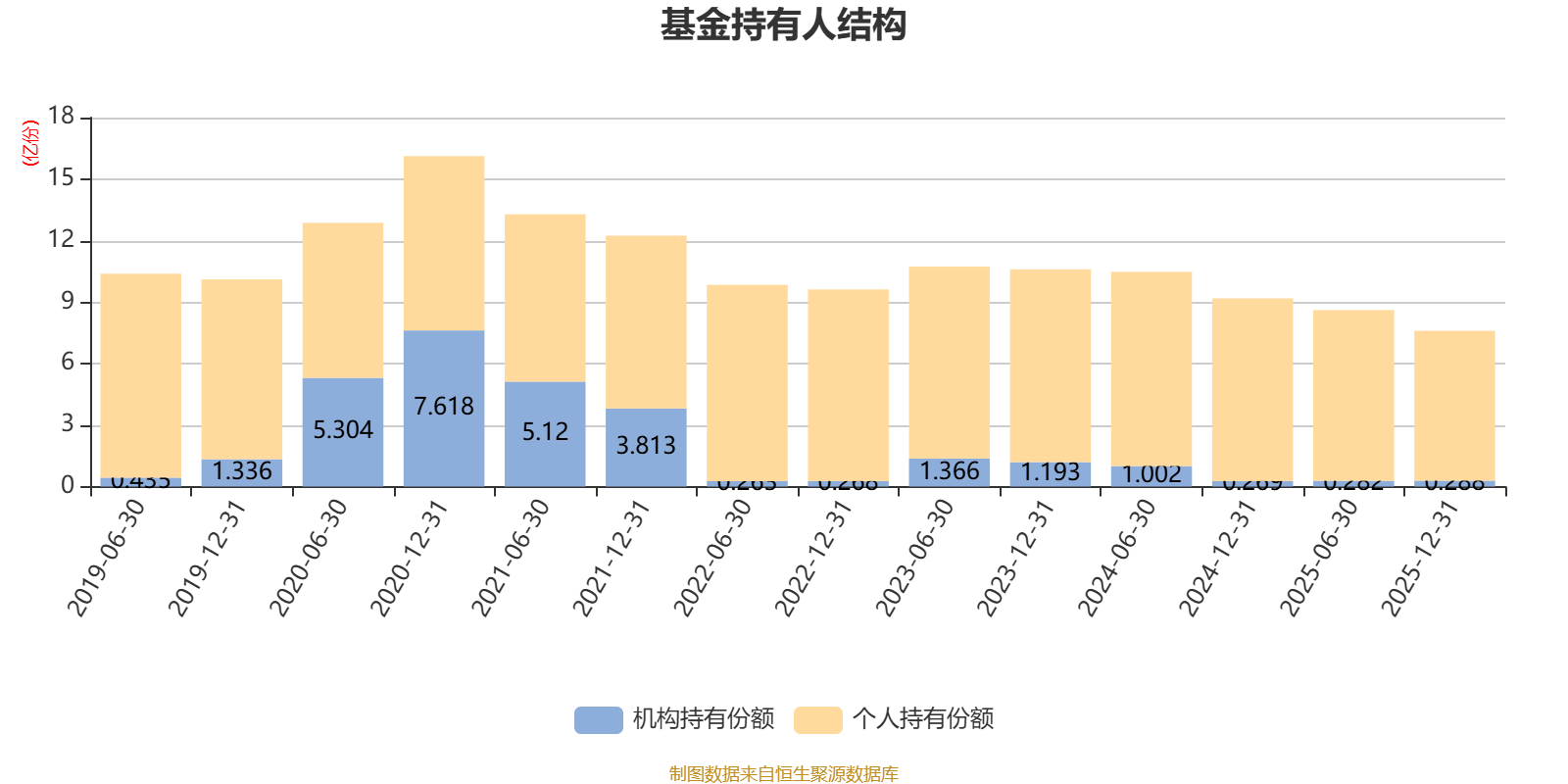 截至2025年12月31日,基金持有人共计10.15万户,合计持有7.6亿份。其中管理人员工持有371.82万份,占比0.49%,机构持有份额占比3.79%,个人投资者占比96.21%。
