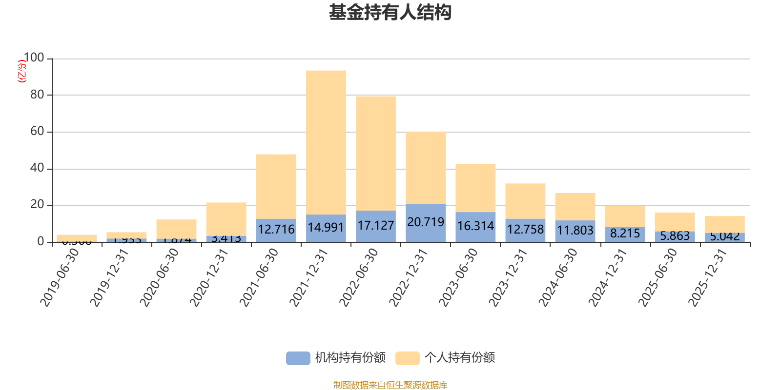 截至2025年12月31日,基金持有人共计10万户,合计持有14.16亿份。其中管理人员工持有180.37万份,占比0.13%,机构持有份额占比35.60%,个人投资者占比64.40%。
