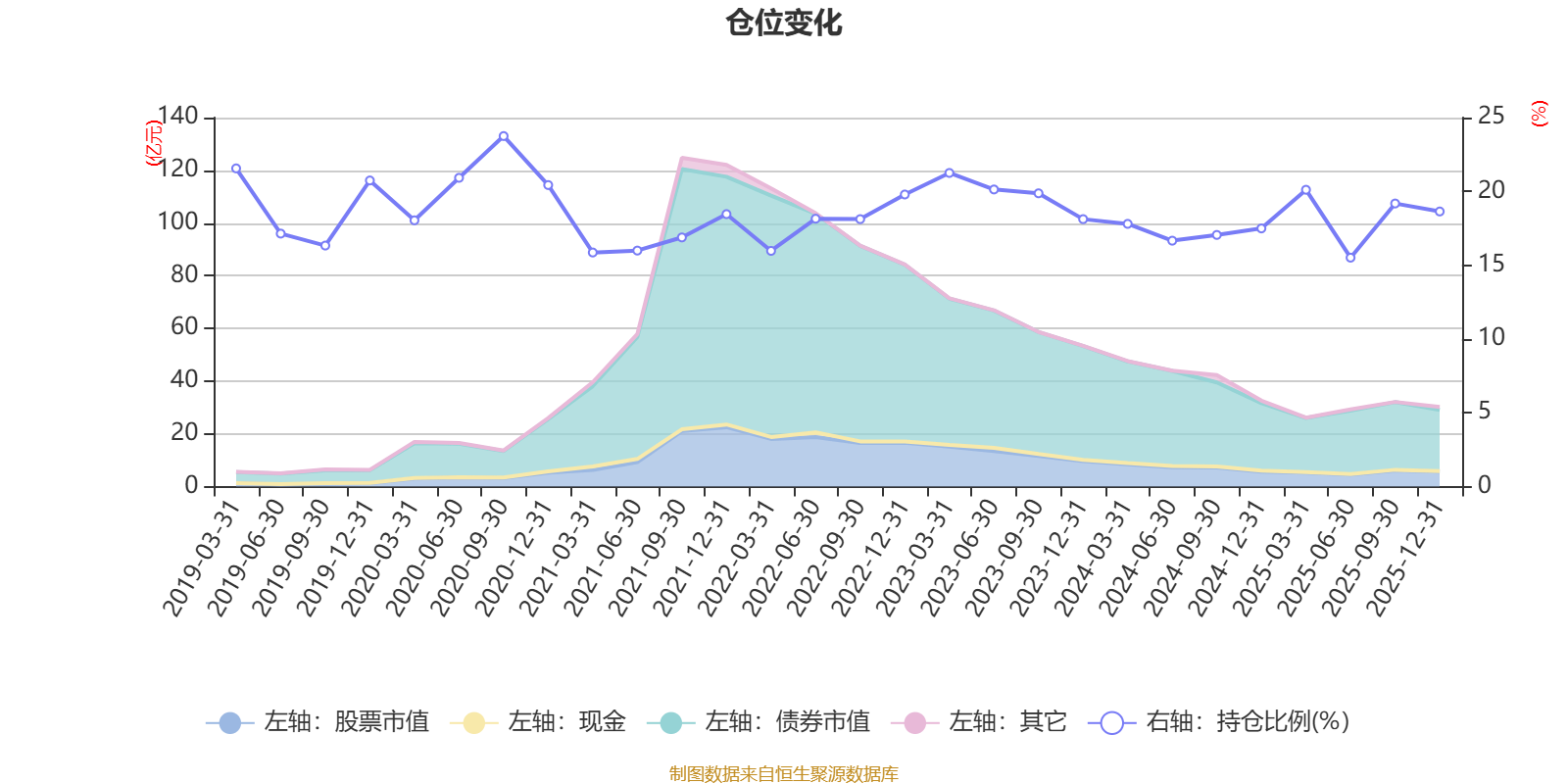 据定期报告数据统计,近三年平均股票仓位为18.48%,同类平均为19.2%。2020年三季度末基金达到23.75%的最高仓位,2025年上半年末最低,为15.51%。