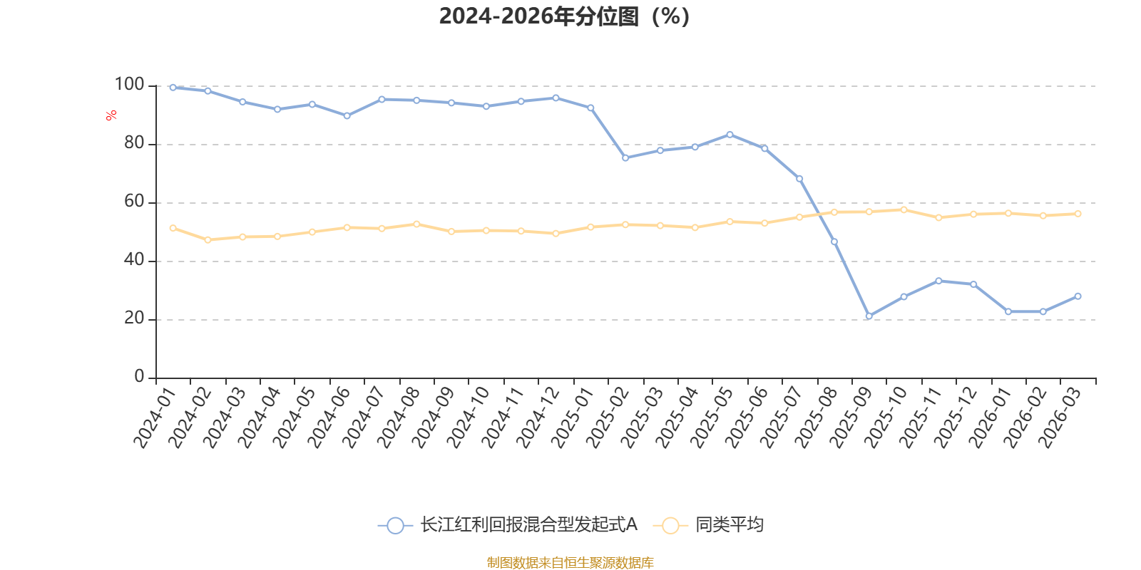通过所选区间该基金净值增长率分位图,可以观察该基金与同类基金业绩比较情况。图为坐标原点到区间内某时点的净值增长率在同类基金中的分位数。