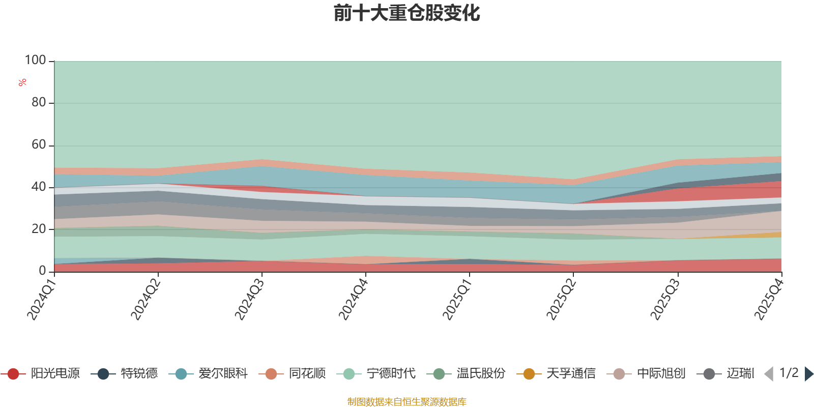 且持股标的较为稳定。截至2025年末,基金十大重仓股分别是宁德时代、中际旭创、新易盛、阳光电源、东方财富、胜宏科技、汇川技术、蓝思科技、亿纬锂能、天孚通信。