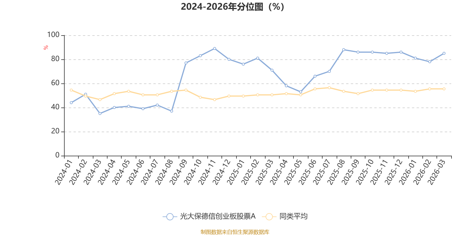 通过所选区间该基金净值增长率分位图,可以观察该基金与同类基金业绩比较情况。图为坐标原点到区间内某时点的净值增长率在同类基金中的分位数。
