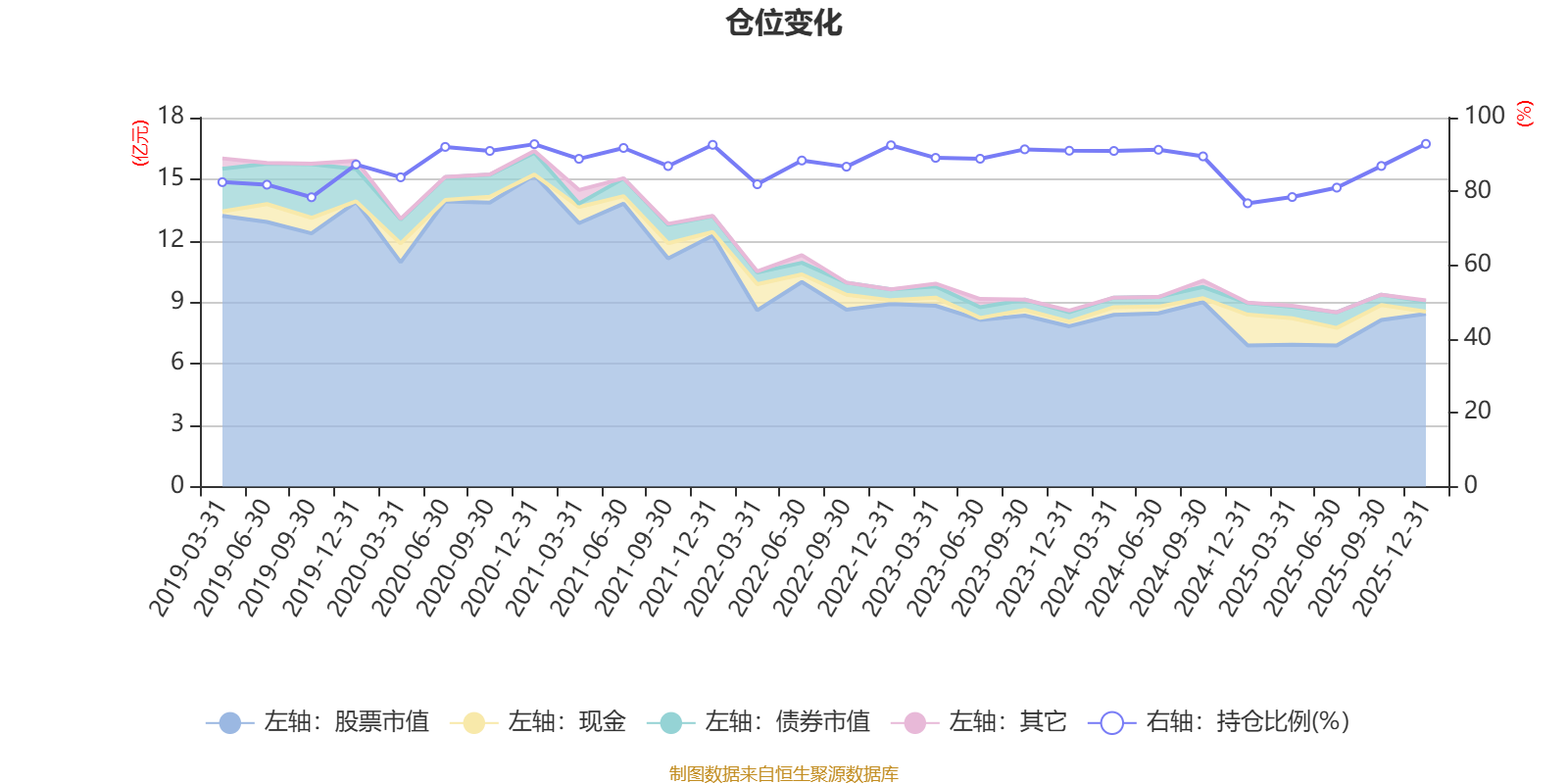 据定期报告数据统计,近三年平均股票仓位为87.35%,同类平均为67.52%。2025年末基金达到92.89%的最高仓位,2024年末最低,为76.78%。