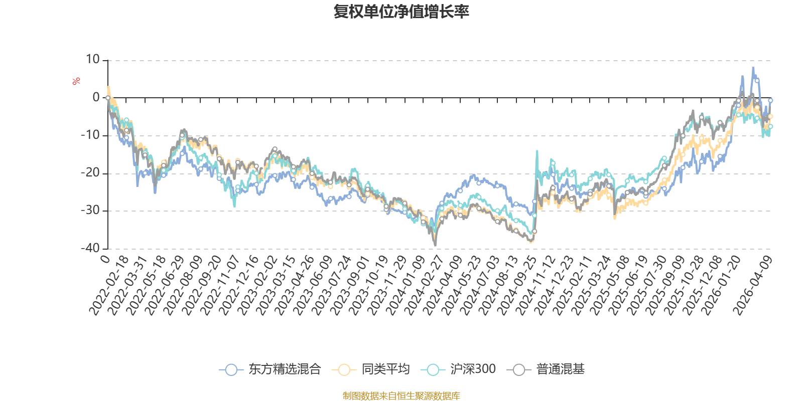 截至4月9日,东方精选混合近三个月复权单位净值增长率为3.81%,位于同类可比基金25/134;近半年复权单位净值增长率为14.38%,位于同类可比基金9/134;近一年复权单位净值增长率为38.95%,位于同类可比基金47/134;近三年复权单位净值增长率为27.19%,位于同类可比基金34/126。