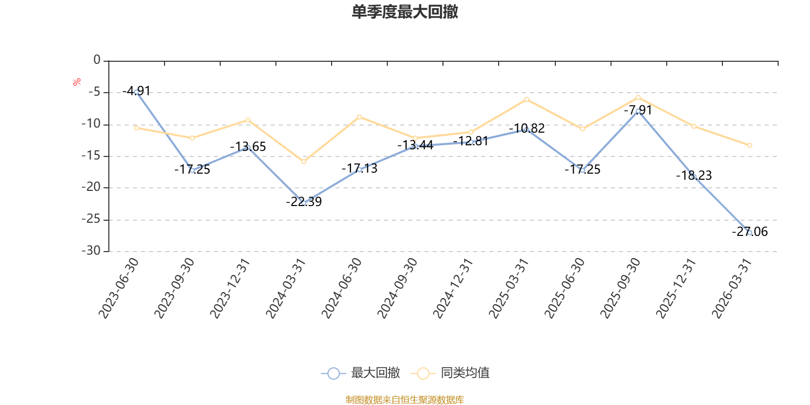 截至4月8日,基金近三年最大回撤为43.17%,同类可比基金排名326/392。单季度最大回撤出现在2026年一季度,为27.06%。