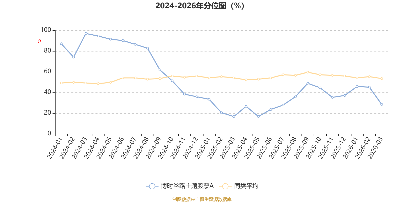 通过所选区间该基金净值增长率分位图,可以观察该基金与同类基金业绩比较情况。图为坐标原点到区间内某时点的净值增长率在同类基金中的分位数。