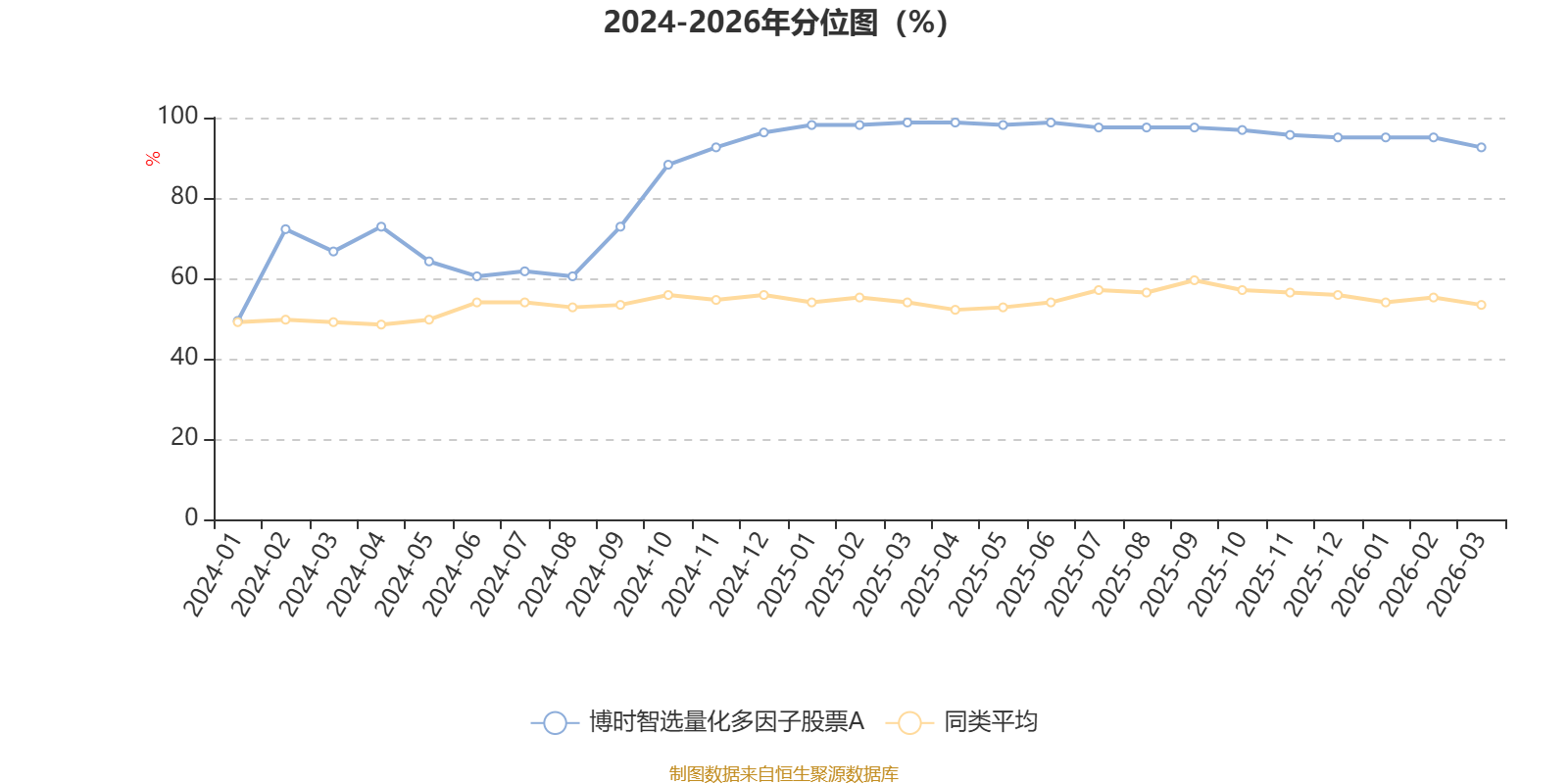 通过所选区间该基金净值增长率分位图,可以观察该基金与同类基金业绩比较情况。图为坐标原点到区间内某时点的净值增长率在同类基金中的分位数。