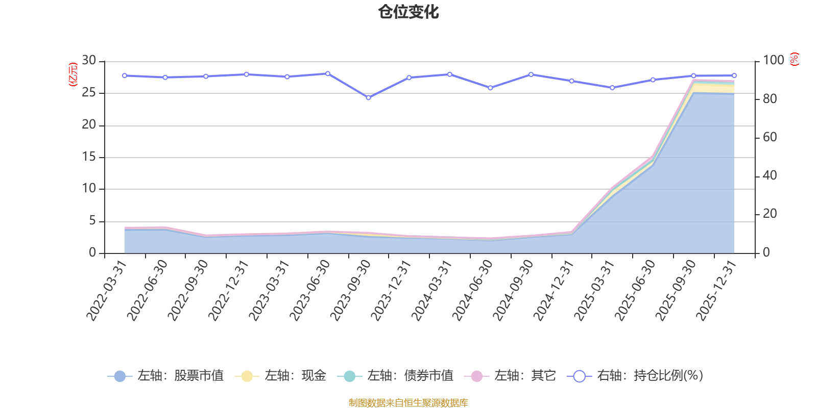 据定期报告数据统计,近三年平均股票仓位为90.13%,同类平均为88.27%。2023年上半年末基金达到93.54%的最高仓位,2023年三季度末最低,为81.04%。