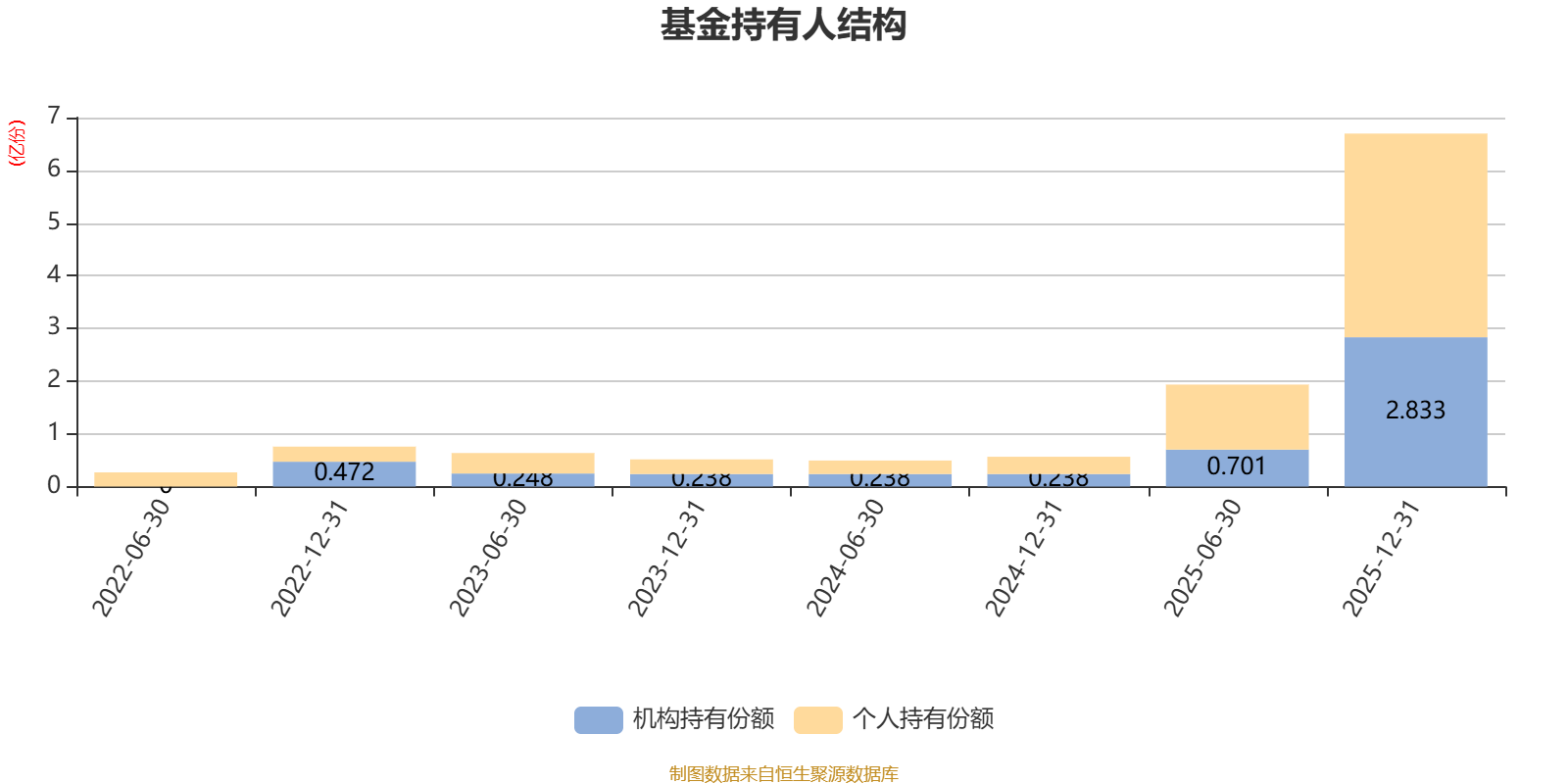 截至2025年12月31日,基金持有人共计1.91万户,合计持有6.7亿份。其中管理人员工持有426.51万份,占比0.64%,机构持有份额占比42.30%,个人投资者占比57.70%。