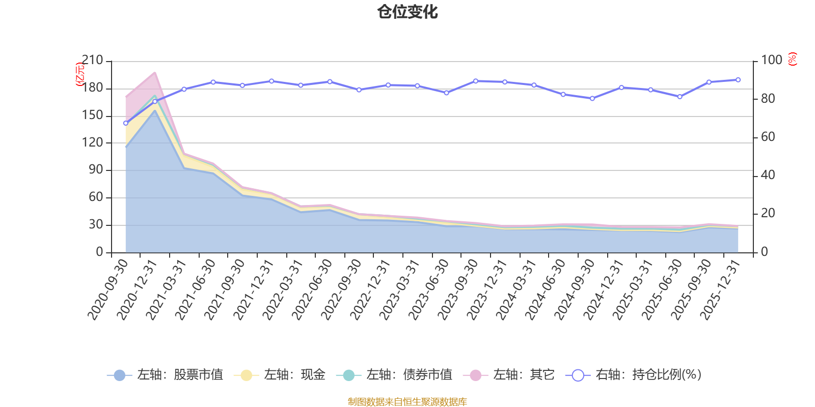 据定期报告数据统计,近三年平均股票仓位为85.96%,同类平均为88.64%。2025年末基金达到90.22%的最高仓位,2020年三季度末最低,为67.59%。