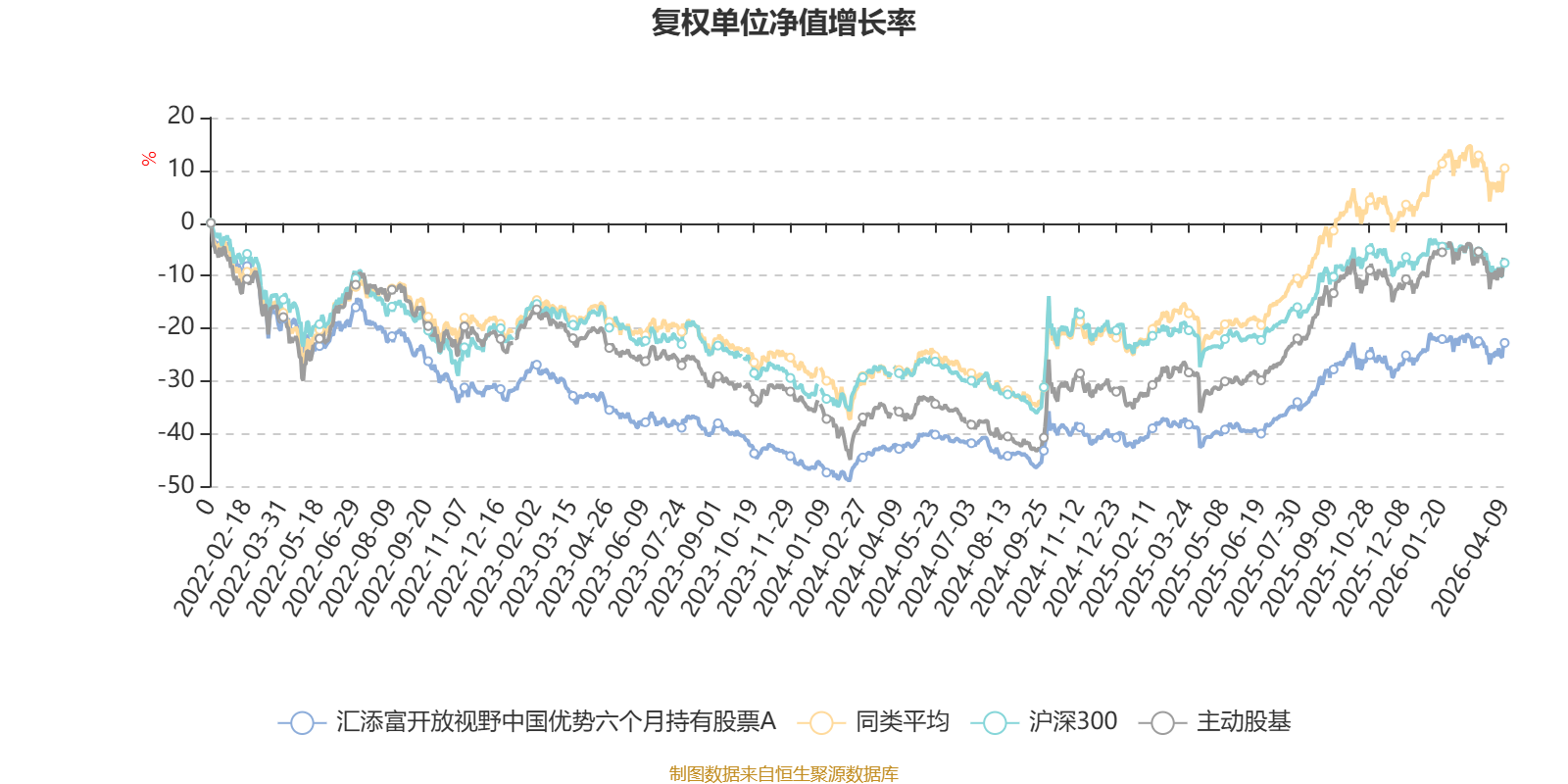 截至4月9日,汇添富开放视野中国优势六个月持有股票A近三个月复权单位净值增长率为-1.33%,位于同类可比基金37/58;近半年复权单位净值增长率为0.00%,位于同类可比基金34/58;近一年复权单位净值增长率为34.02%,位于同类可比基金37/57;近三年复权单位净值增长率为14.42%,位于同类可比基金43/57。
