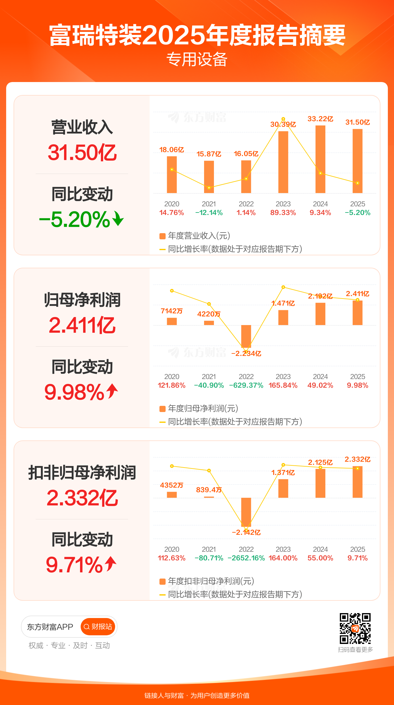 富瑞特装4月11日发布2025年年报显示,公司全年实现营业收入31.50亿元,同比下滑5.20%;归母净利润2.41亿元,同比增长9.98%;扣非归母净利润2.33亿元,同比增长9.71%。