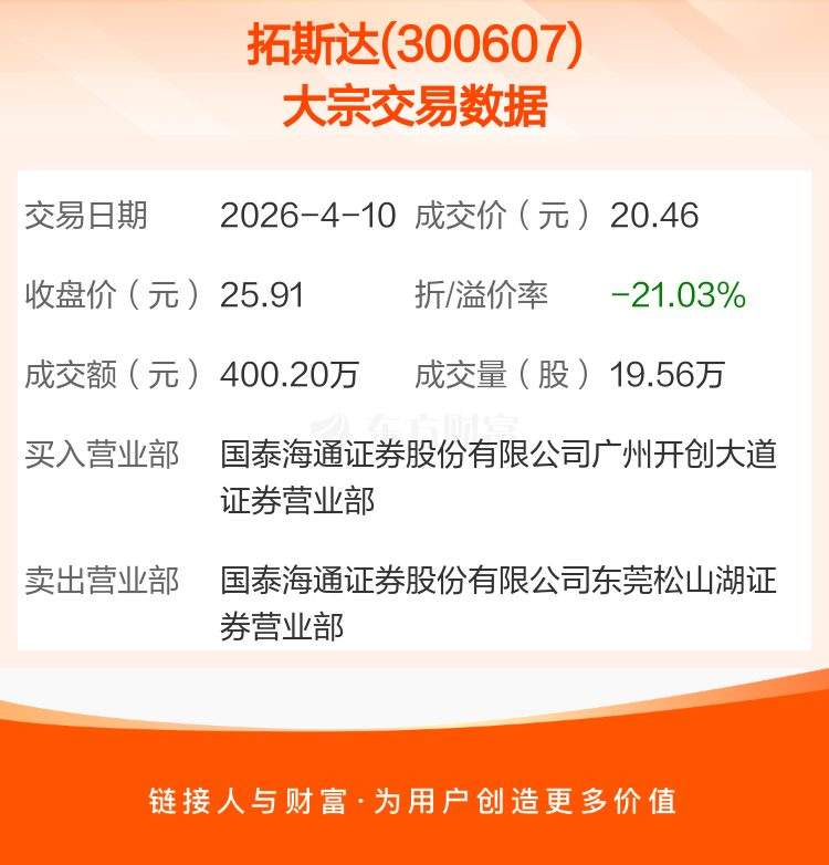2026年4月10日,拓斯达发生1笔大宗交易,共成交19.56万股,成交金额400.20万元,占其流通市值比例为0.05%。