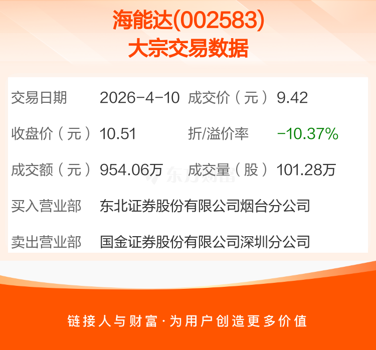2026年4月10日,海能达发生1笔大宗交易,共成交101.28万股,成交金额954.06万元,占其流通市值比例为0.07%。