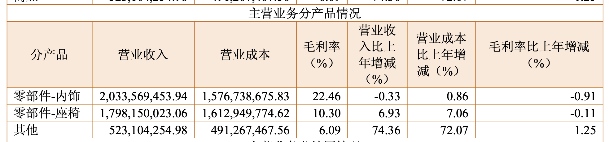 2025年,公司零部件内饰业务实现主营业务收入20.34亿元,同比下降0.33%,零部件内饰销售45.54万台套,同比增长18.67%;零部件座椅业务实现主营业务收入17.98亿元,同比增长6.93%,零部件座椅销售20.35万台套,同比增长7.45%。