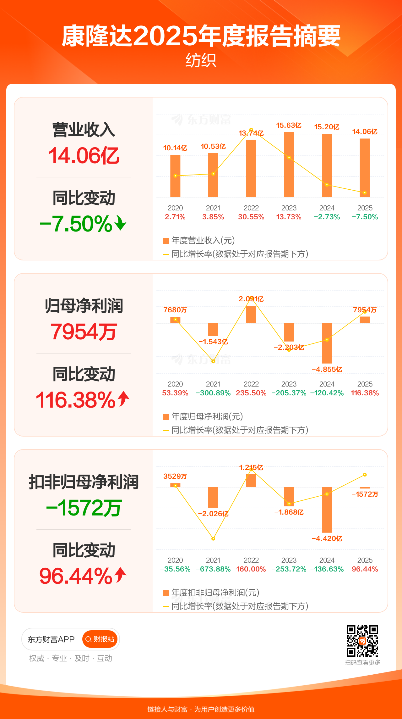 康隆达4月11日发布2025年年报显示,公司全年实现营业收入14.06亿元,同比下滑7.50%;归母净利润7953.99万元,同比增长116.38%;扣非归母净利润-1572.28万元。