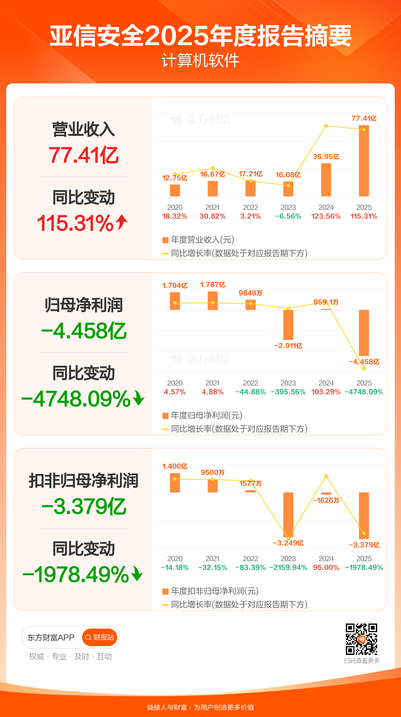 亚信安全4月11日发布2025年年报显示,公司全年实现营业收入77.41亿元,同比增长115.31%;归母净利润-4.46亿元;扣非归母净利润-3.38亿元。