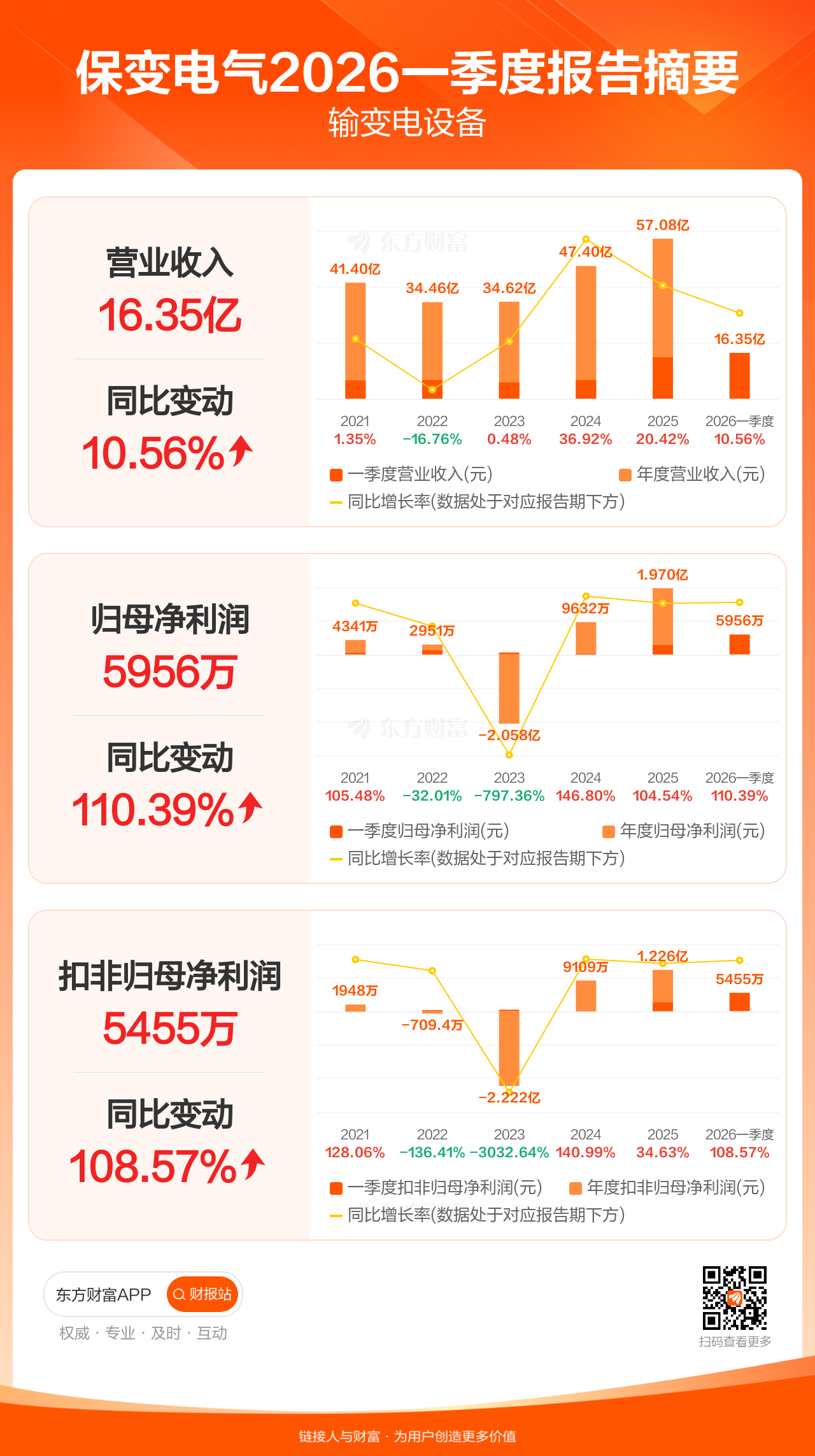 保变电气4月11日发布2026年一季报显示,公司一季度实现营业收入16.35亿元,同比增长10.56%;归母净利润5956.36万元,同比增长110.39%;扣非归母净利润5455.02万元,同比增长108.57%。