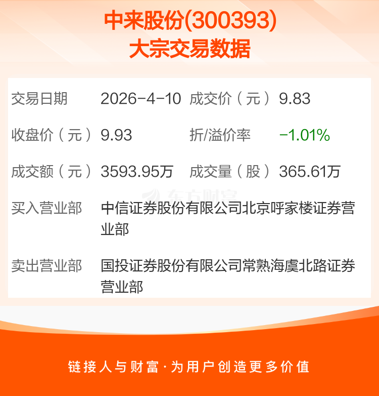 2026年4月10日,中来股份发生1笔大宗交易,共成交365.61万股,成交金额3593.95万元,占其流通市值比例为0.38%。