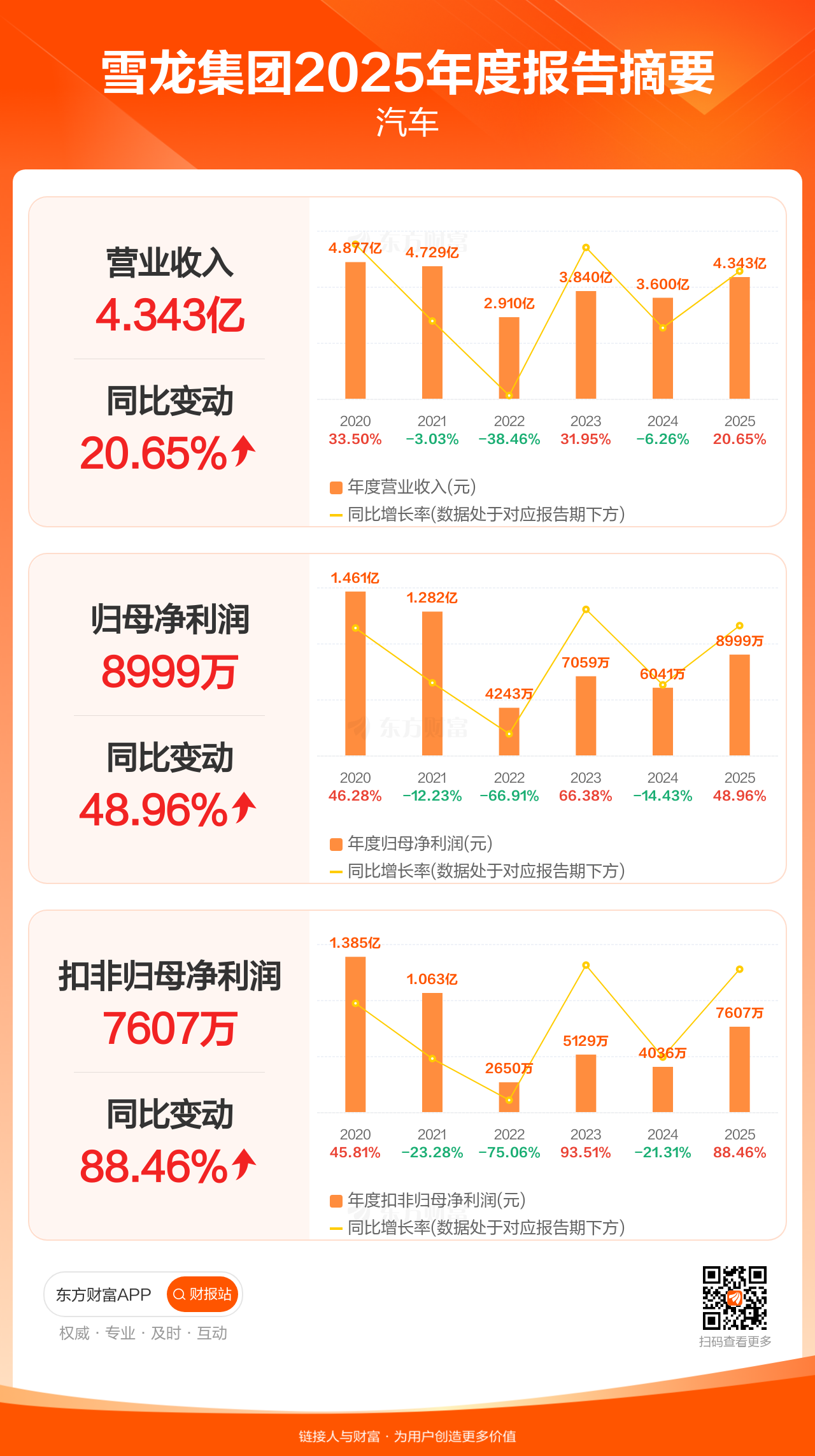 雪龙集团4月11日发布2025年年报显示,公司全年实现营业收入4.34亿元,同比增长20.65%;归母净利润8998.51万元,同比增长48.96%;扣非归母净利润7606.61万元,同比增长88.46%。