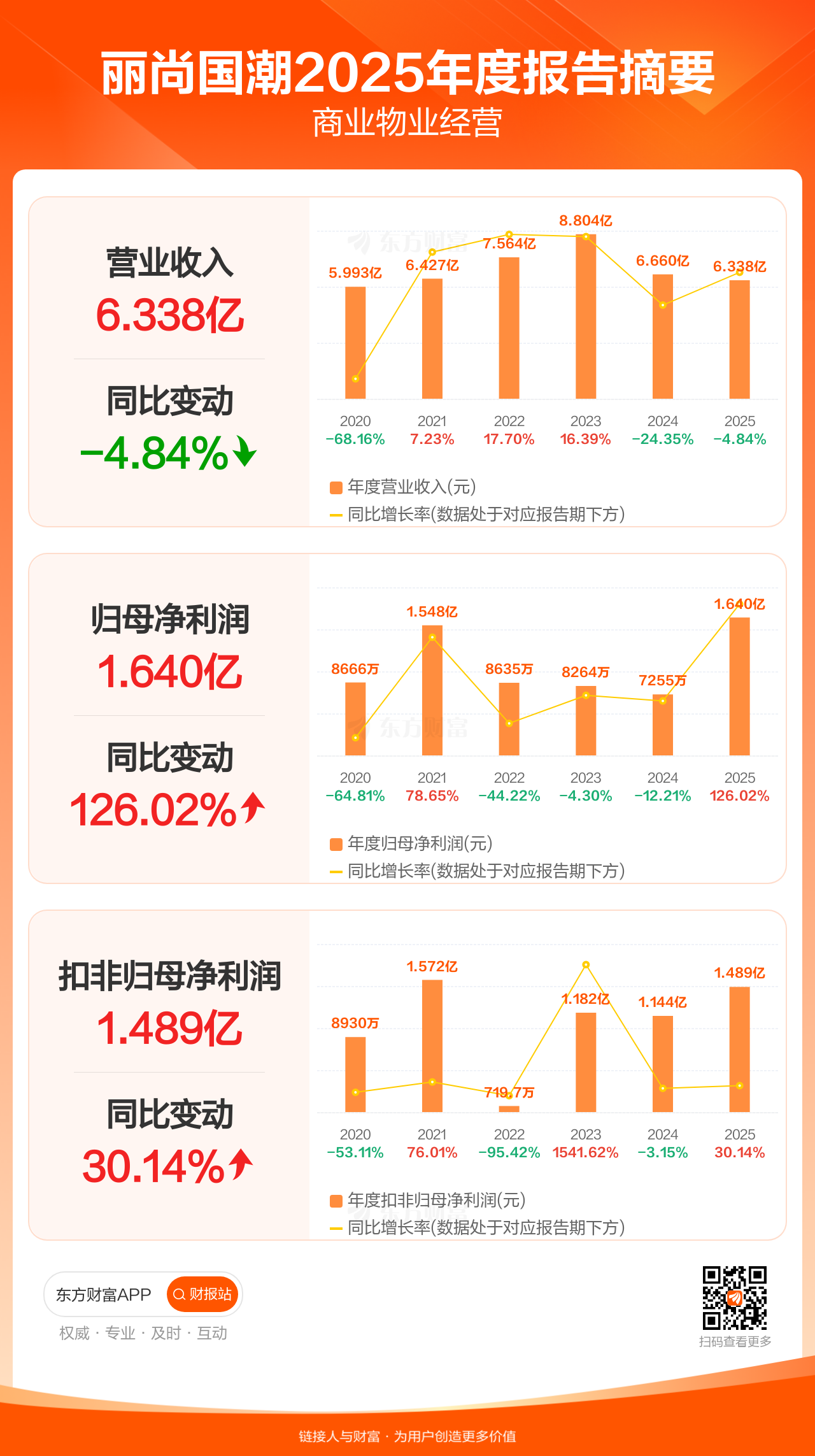 丽尚国潮4月11日发布2025年年报显示,公司全年实现营业收入6.34亿元,同比下滑4.84%;归母净利润1.64亿元,同比增长126.02%;扣非归母净利润1.49亿元,同比增长30.14%。