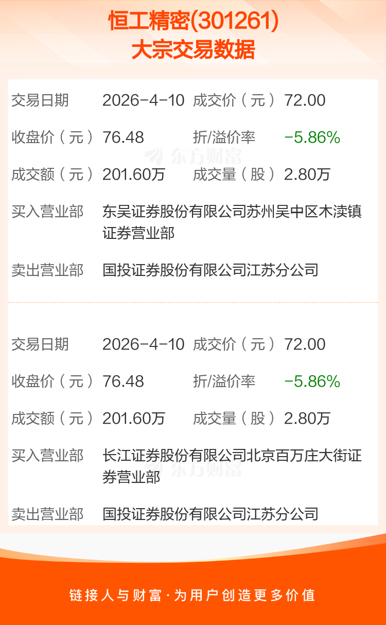 2026年4月10日,恒工精密发生2笔大宗交易,共成交5.60万股,成交金额403.20万元,占其流通市值比例为0.14%。