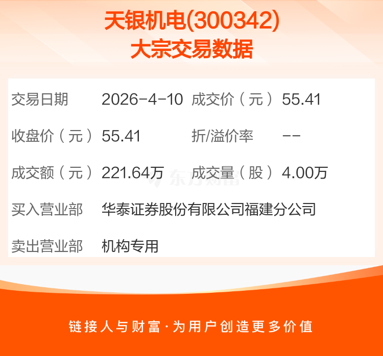 2026年4月10日,天银机电发生1笔大宗交易,共成交4.00万股,成交金额221.64万元。
